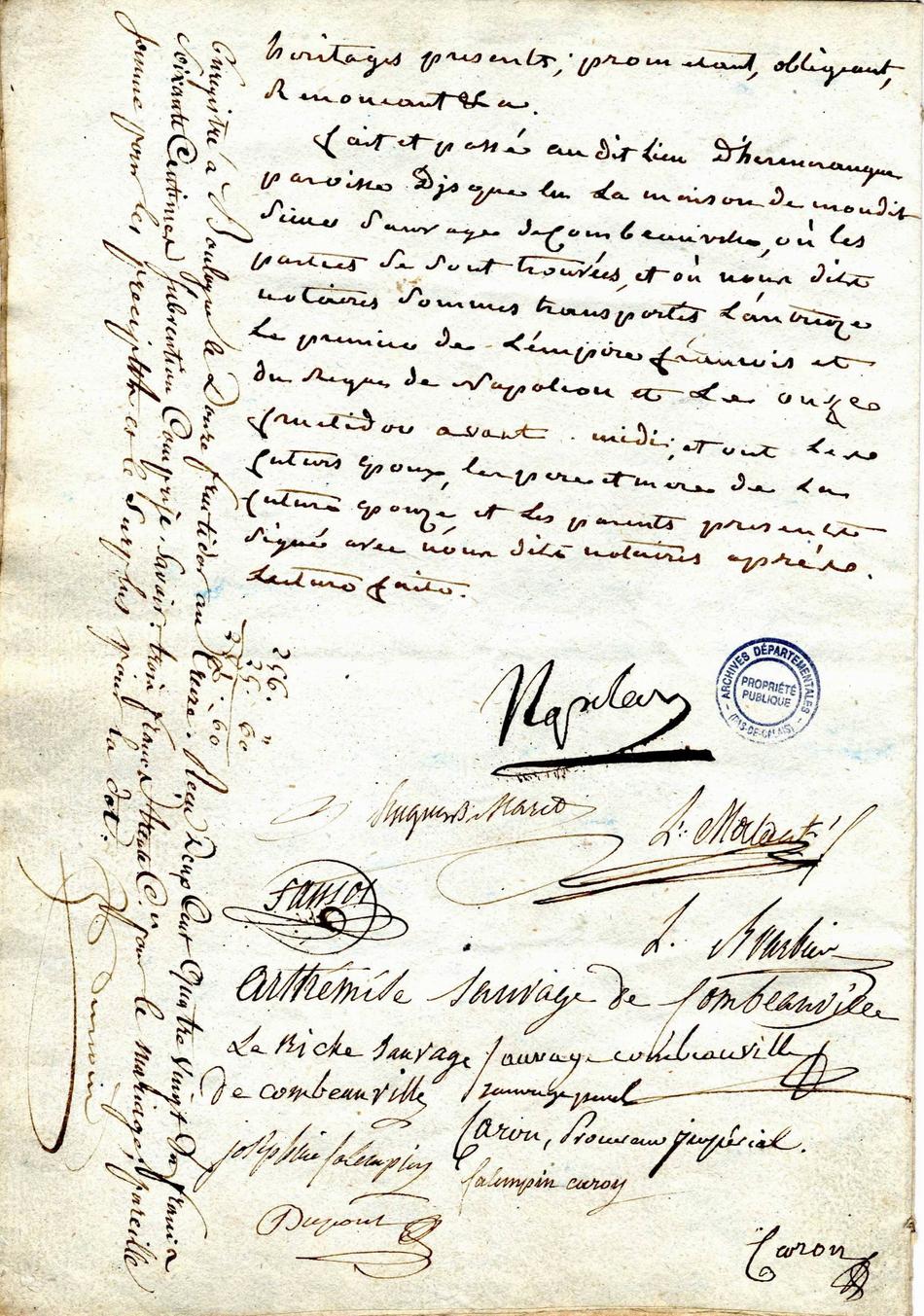 3 Signature de NAPOLEON au contrat de mariage de Joseph SANSOT et A. SAUVAGE de COMBEAUVILLE