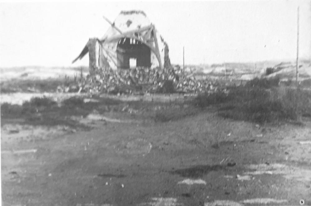Un dimanche de juin, un bombardement intense détruit plusieurs villas et anéantit notre église. Tout est à terre sauf un pan de mur sur lequel est accroché le Christ…