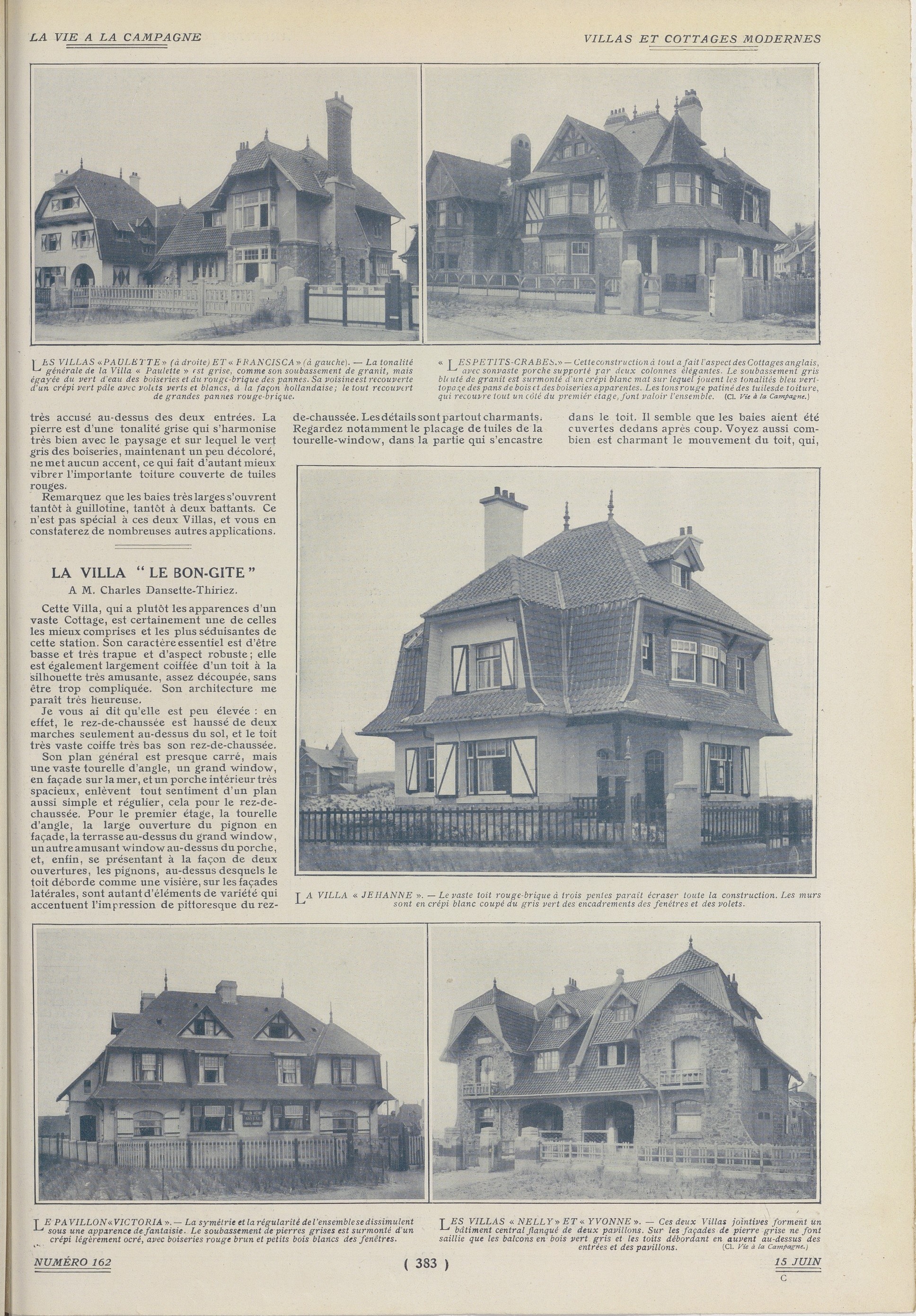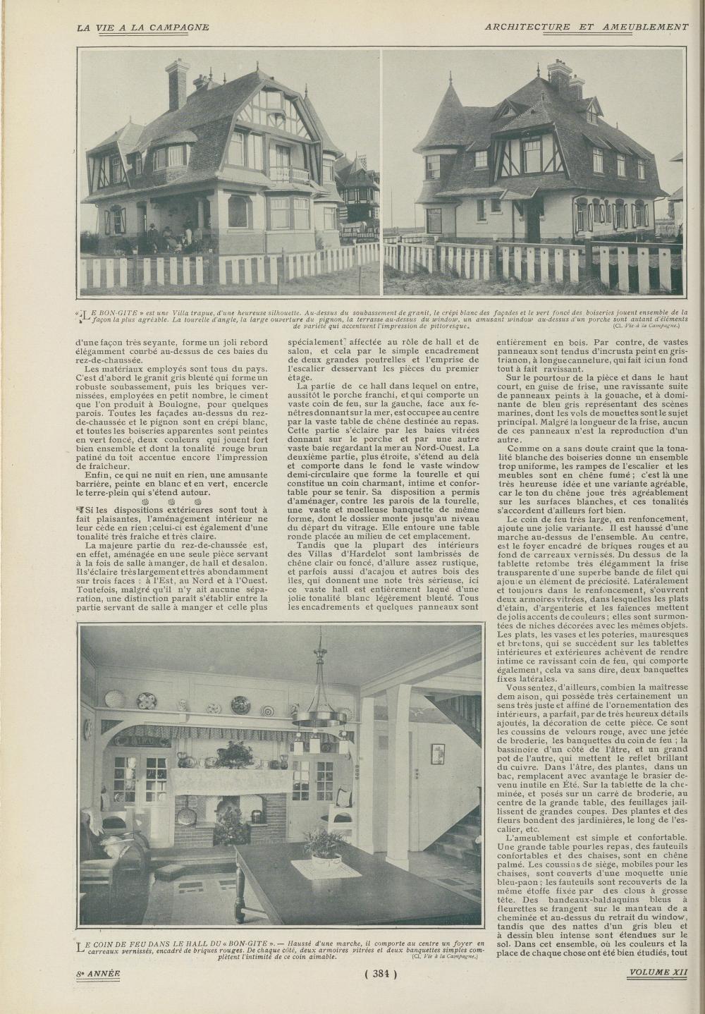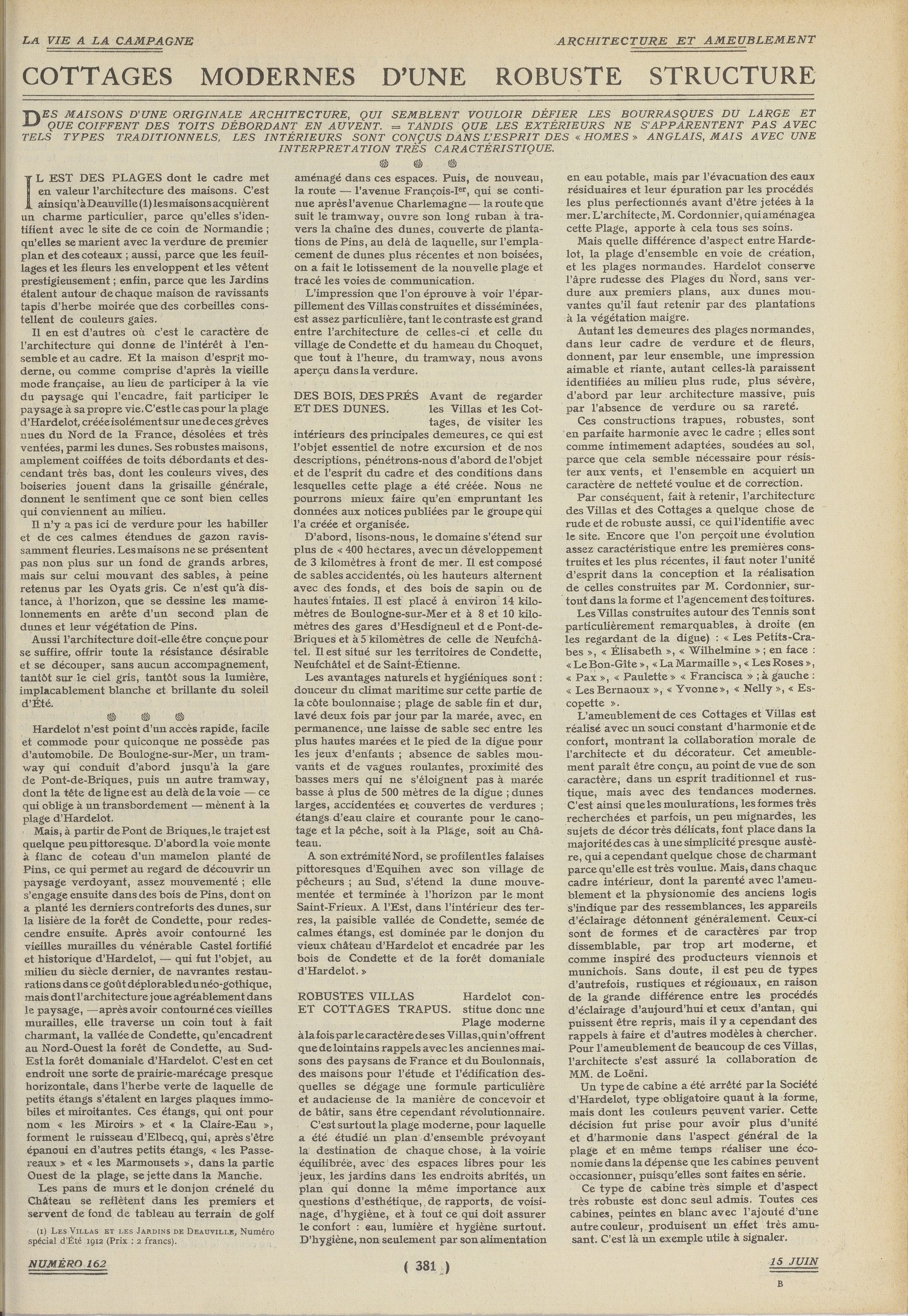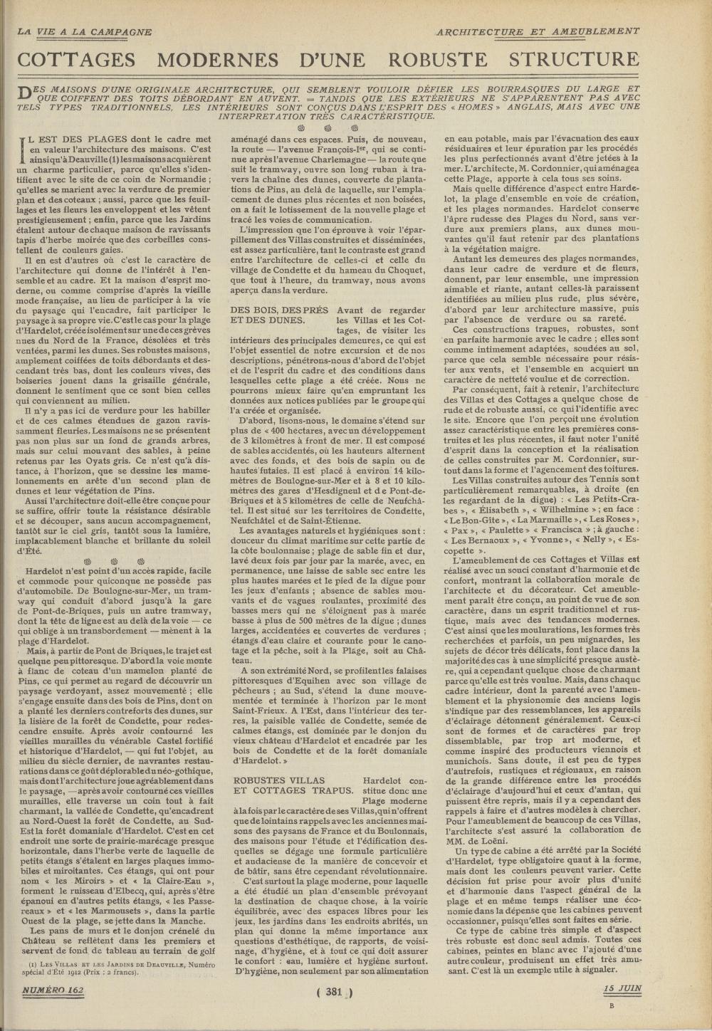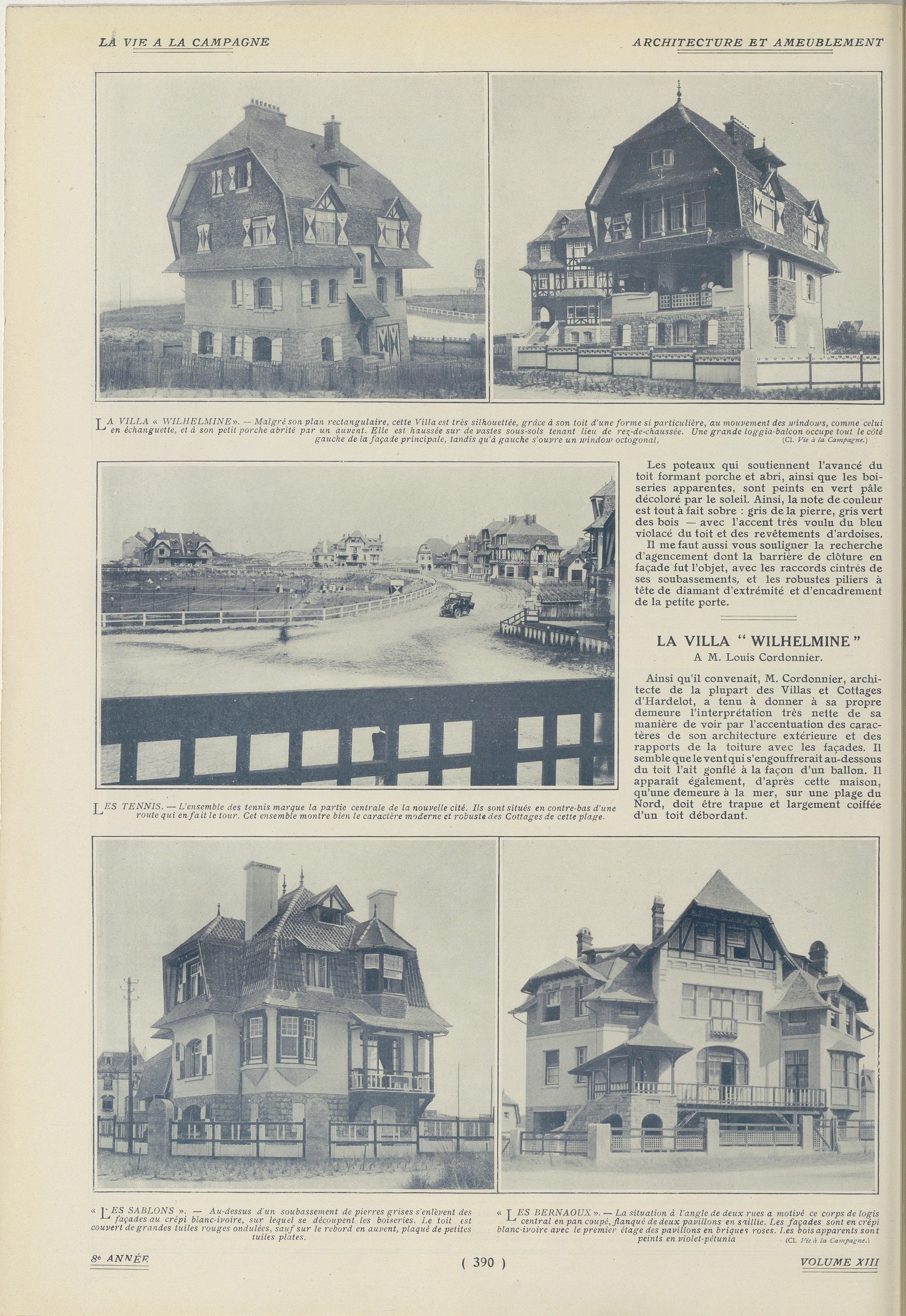 La revue "La Vie à la Campagne du 15 juin 1913 consacre quelques pages à Hardelot-Plage et ses villas du bord de mer. Quelques clichés, comme on disait à l’époque, illustrent l’article et nous montrent ce qu’était notre toute jeune station juste avant la première guerre mondiale. La revue nous fait entrer dans quelques villas pour y découvrir l’agencement et la décoration.