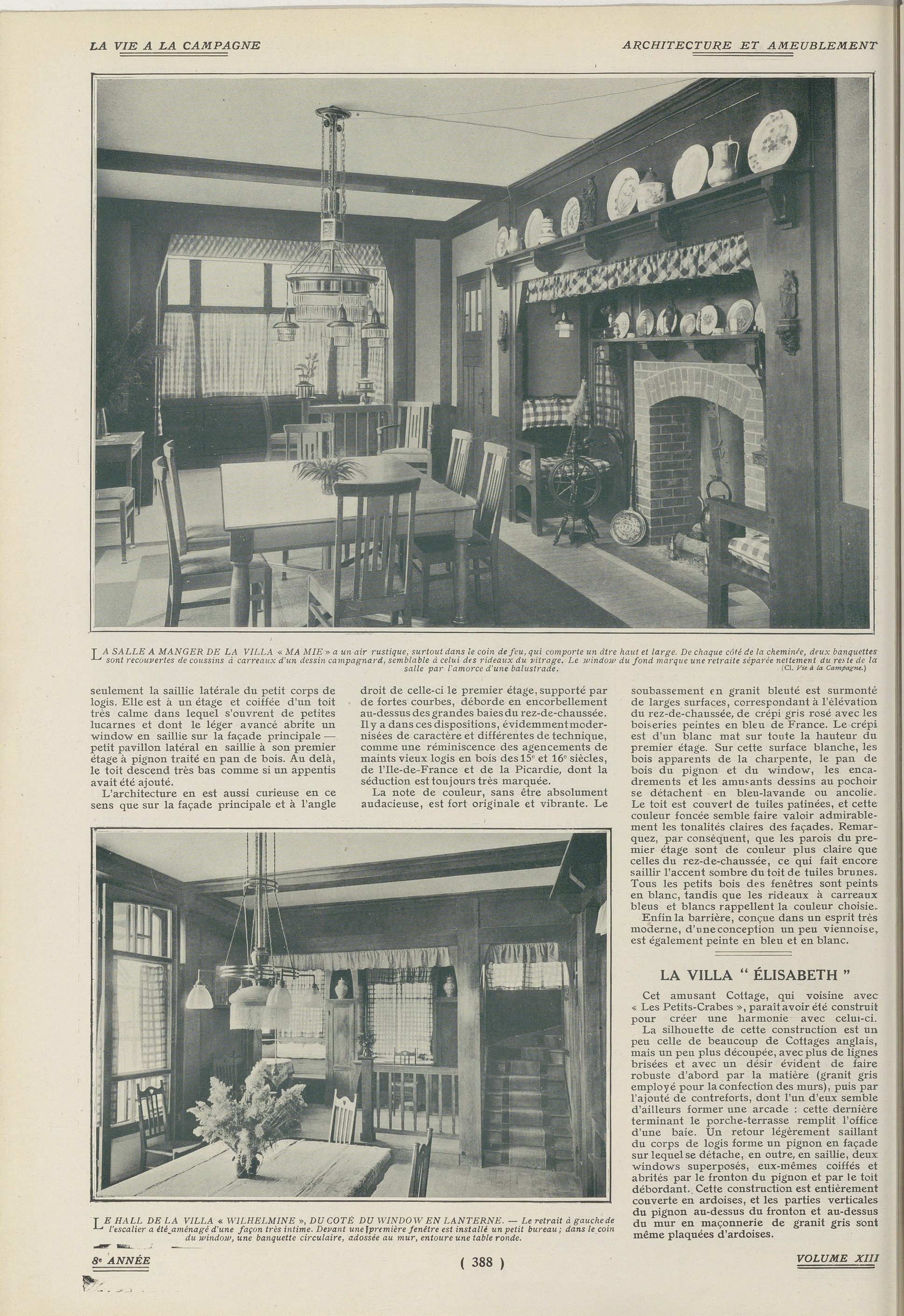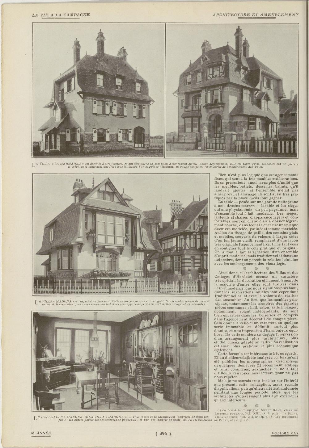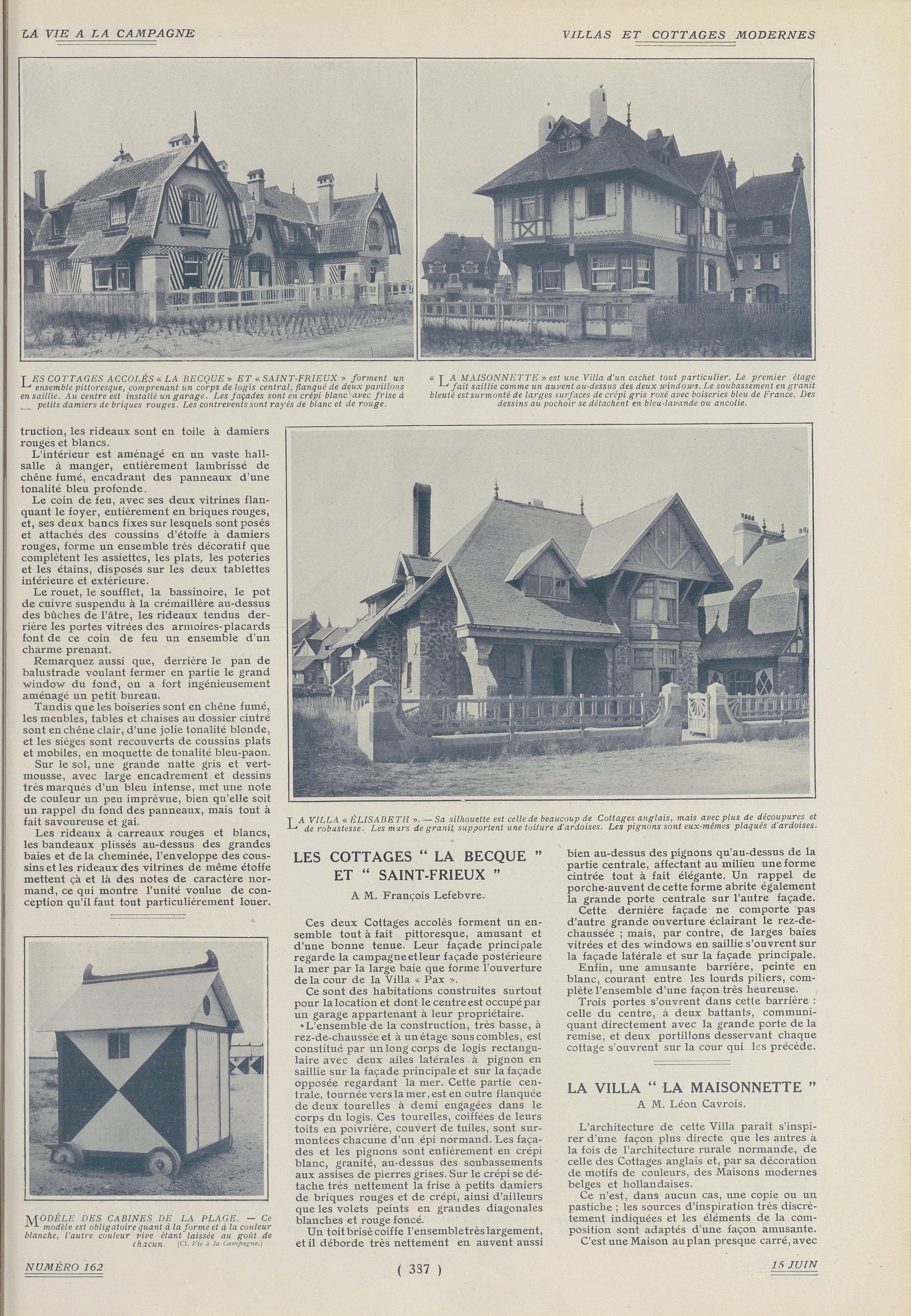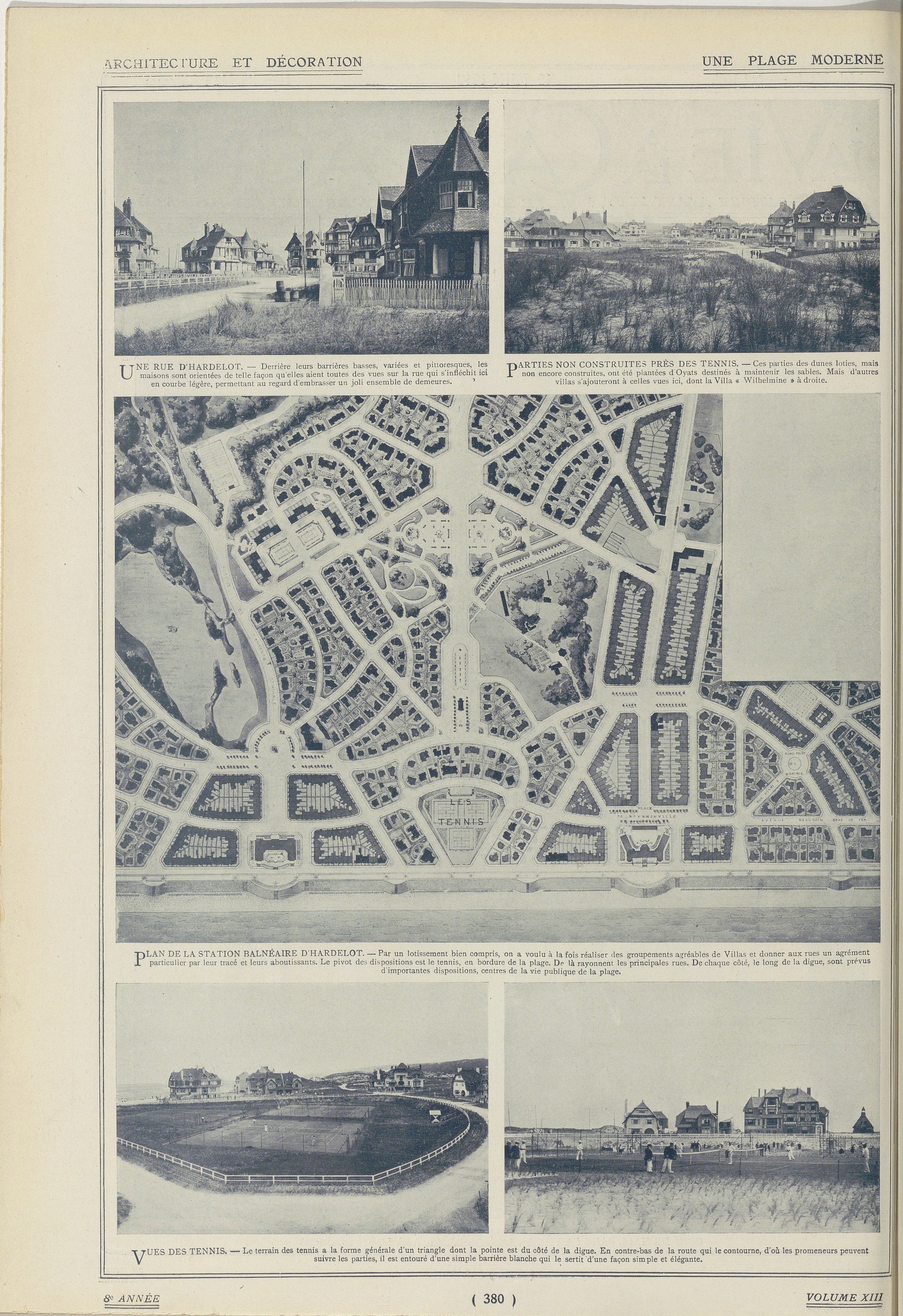 La revue "La Vie à la Campagne du 15 juin 1913 consacre quelques pages à Hardelot-Plage et ses villas du bord de mer. Quelques clichés, comme on disait à l’époque, illustrent l’article et nous montrent ce qu’était notre toute jeune station juste avant la première guerre mondiale. La revue nous fait entrer dans quelques villas pour y découvrir l’agencement et la décoration.