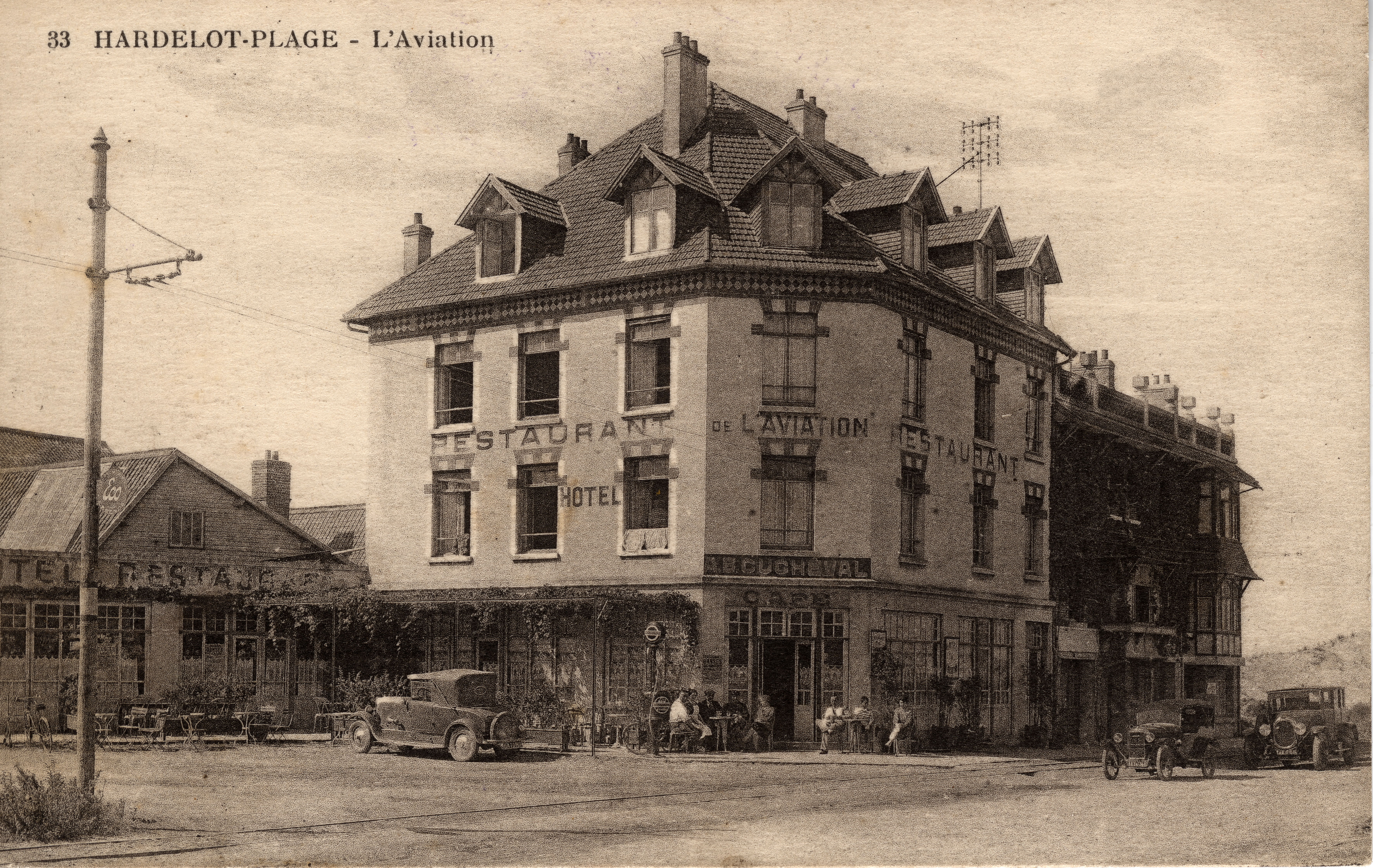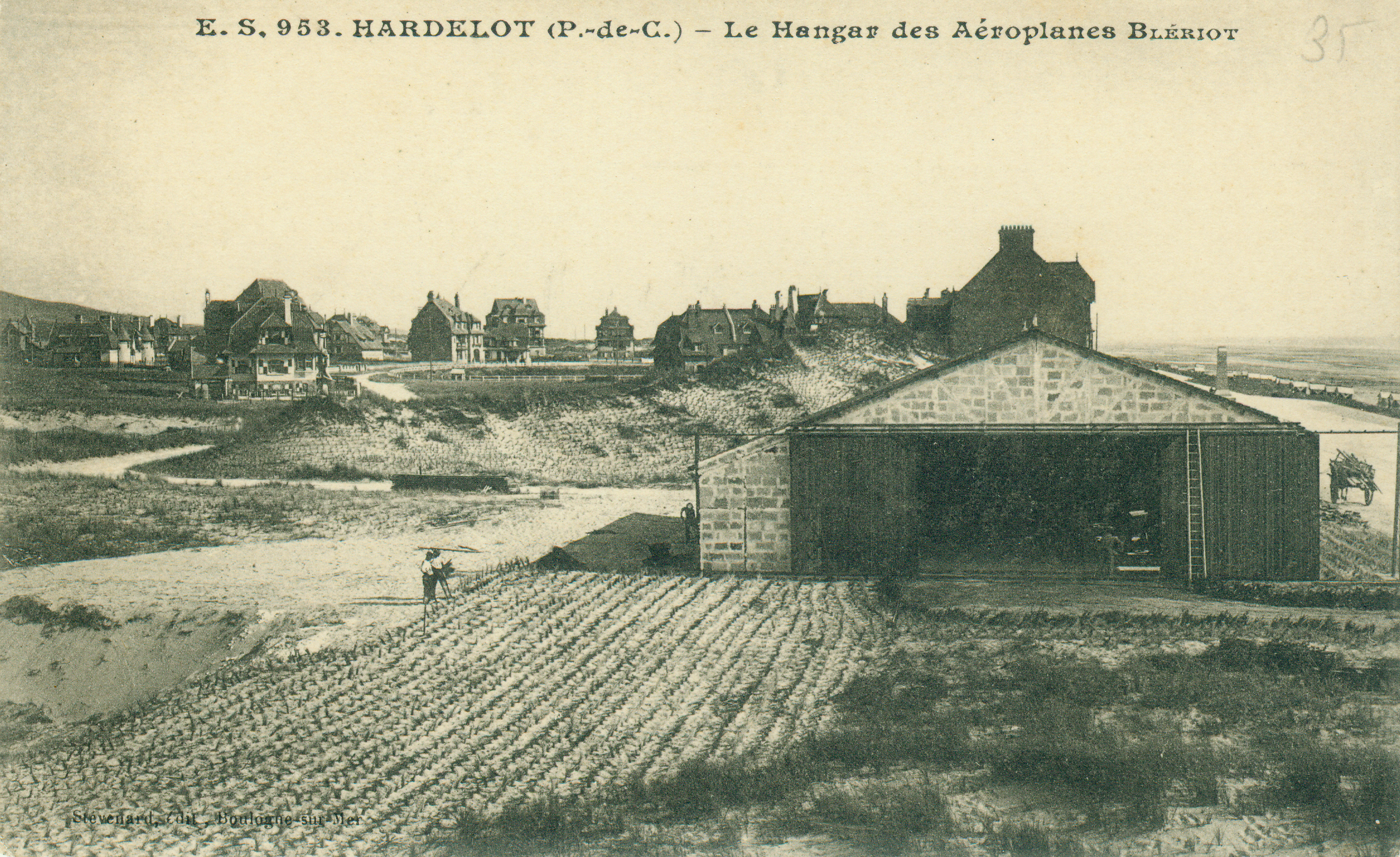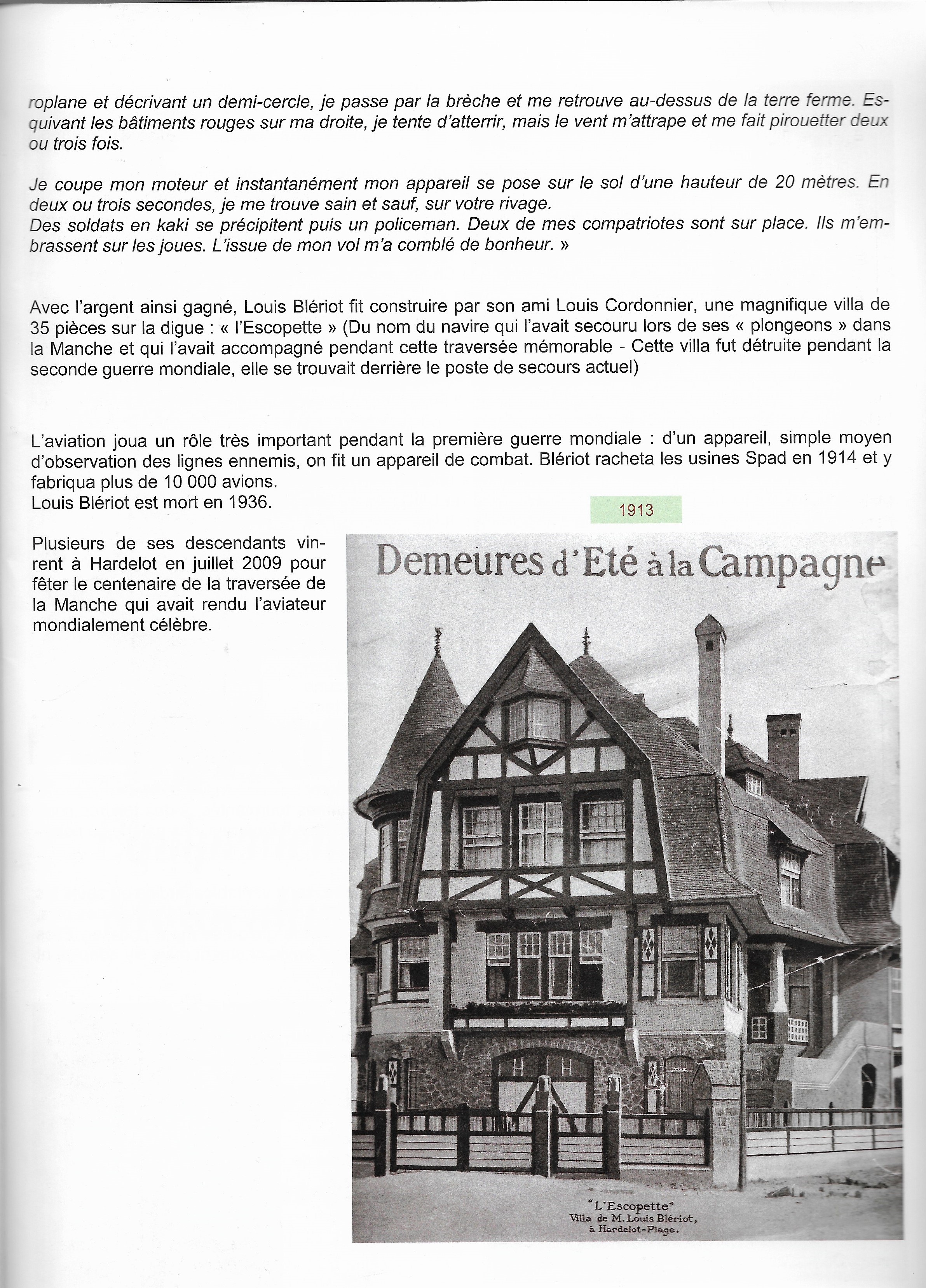 En 1910, Louis Blériot fait construire sa résidence d’été à Hardelot, l’Escopette. Il édifie aussi un hangar pour ses aéroplanes. Bientôt. Le ciel d’Hardelot accueille des vols d’essais effectués par Blériot lui-même mais aussi par d’autres pionniers de l’aviation comme Jean Conneau dit Beaumont et Leblanc qui en septembre 1911 à Hardelot atteint la vitesse de 130 km/h sur un nouvel avion de compétition et pilote en vols d’essais un biplace Blériot-Gnome 70 HP. Hardelot est en effet un site privilégié pour les essais aéronautiques par sa situation, sa longue plage de sable fin et ferme idéale pour les décollages et atterrissages