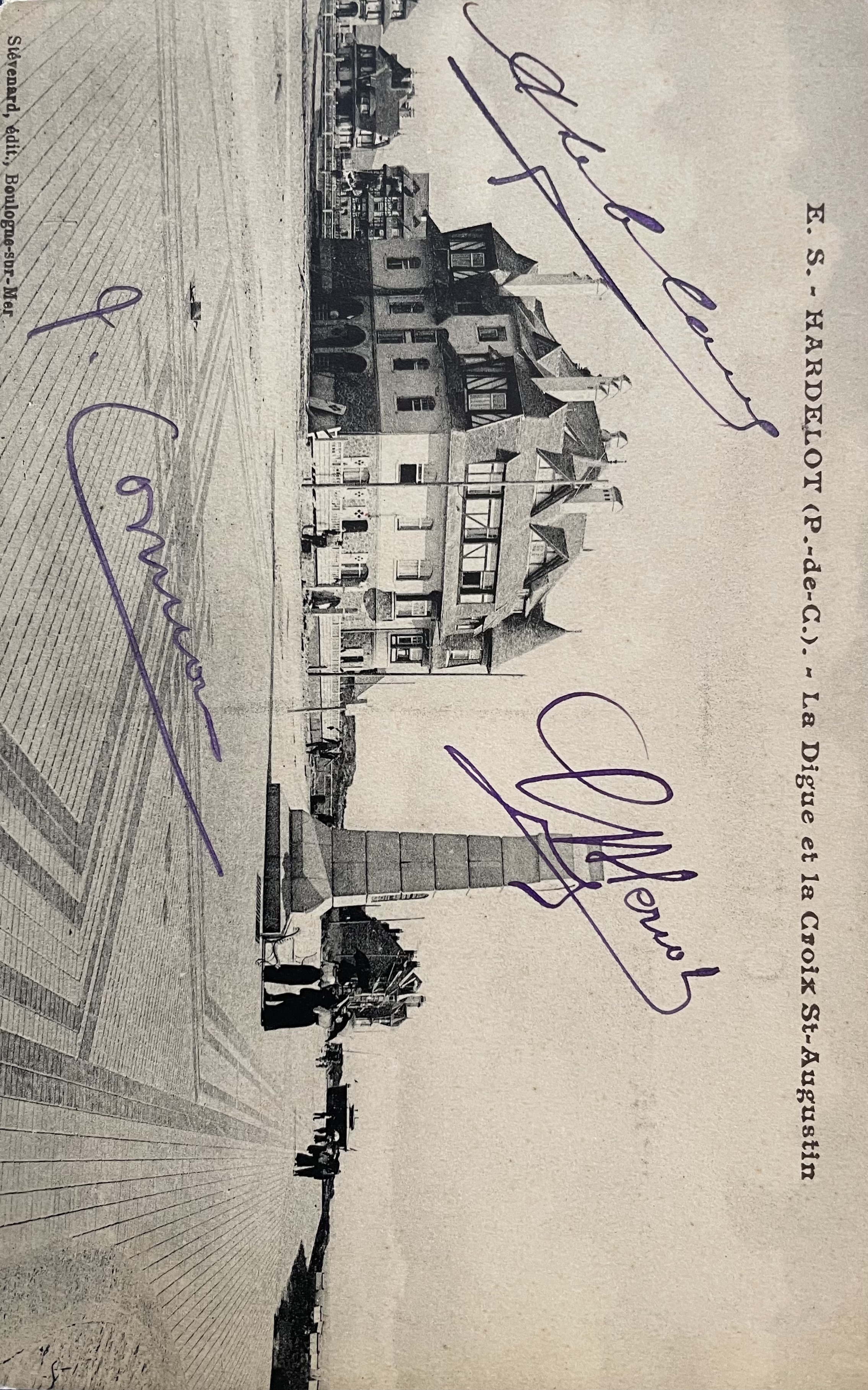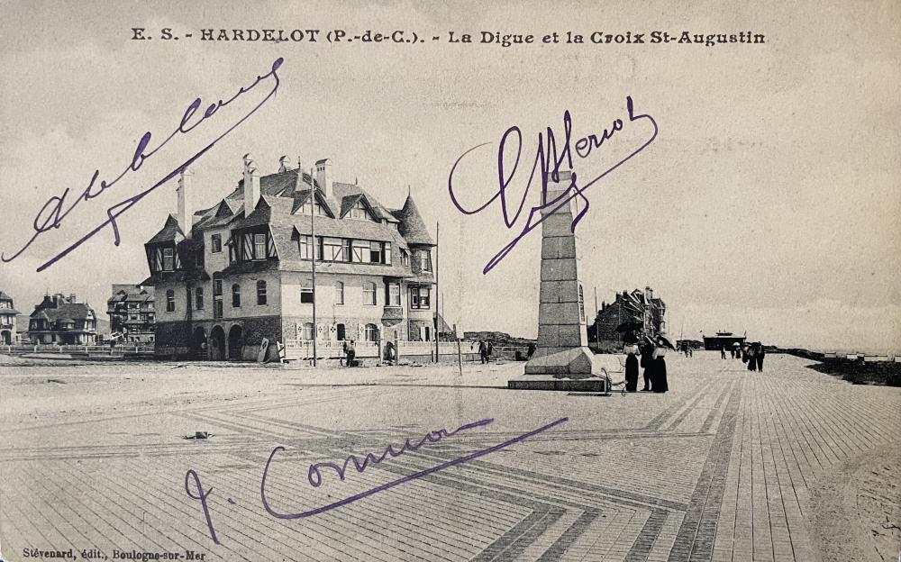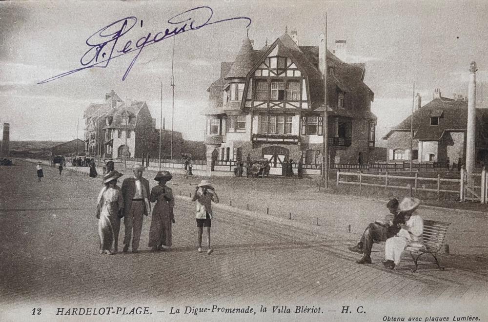 La villa l’Escopette vue 1 vers le sud avec les autographes de Louis Blériot, André Leblanc et Jean Conneau dit Beaumont. On remarquera que la Croix de St Augustin n’a pas encore été déplacée vers la Becque. Elle le sera bientôt à la demande de Blériot parce qu’elle représentait un danger pour les aviateurs.