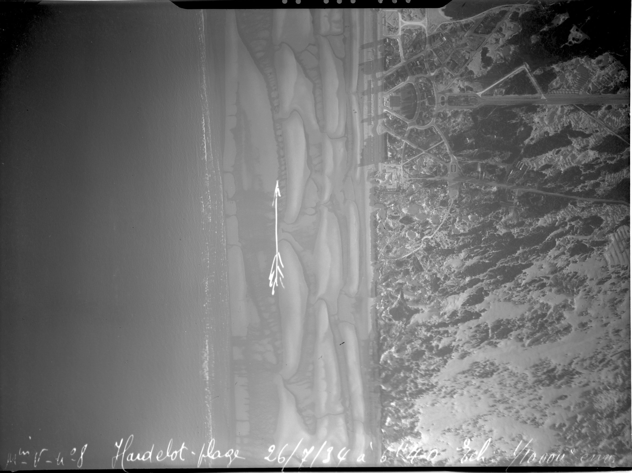 Photo 2 : cette vue prise le 26 juillet 1934 à 6 h 40 montre l’évolution du réseau routier d’Hardelot : on distingue nettement l’avenue Foch, l’avenue François 1er déjà axes de pénétration de la station .De même à partir de la place de l’église se dessine en diagonale l’avenue de Tamaris qui se continue en angle par l’allée des Troènes. Les courts de tennis entre les maisons Cordonnier et la plage sont aussi très visibles