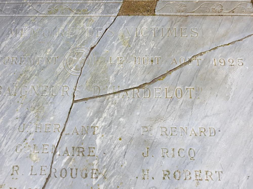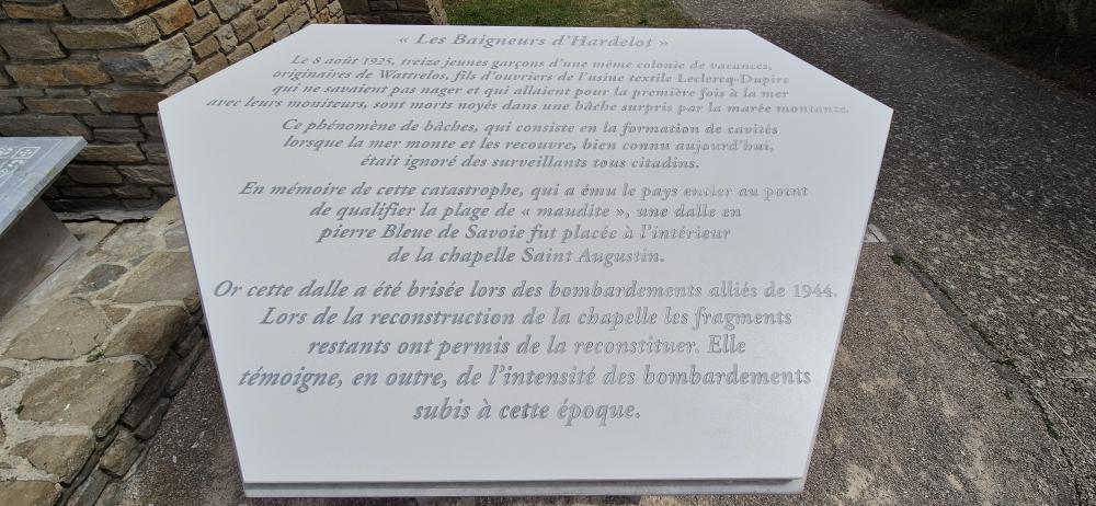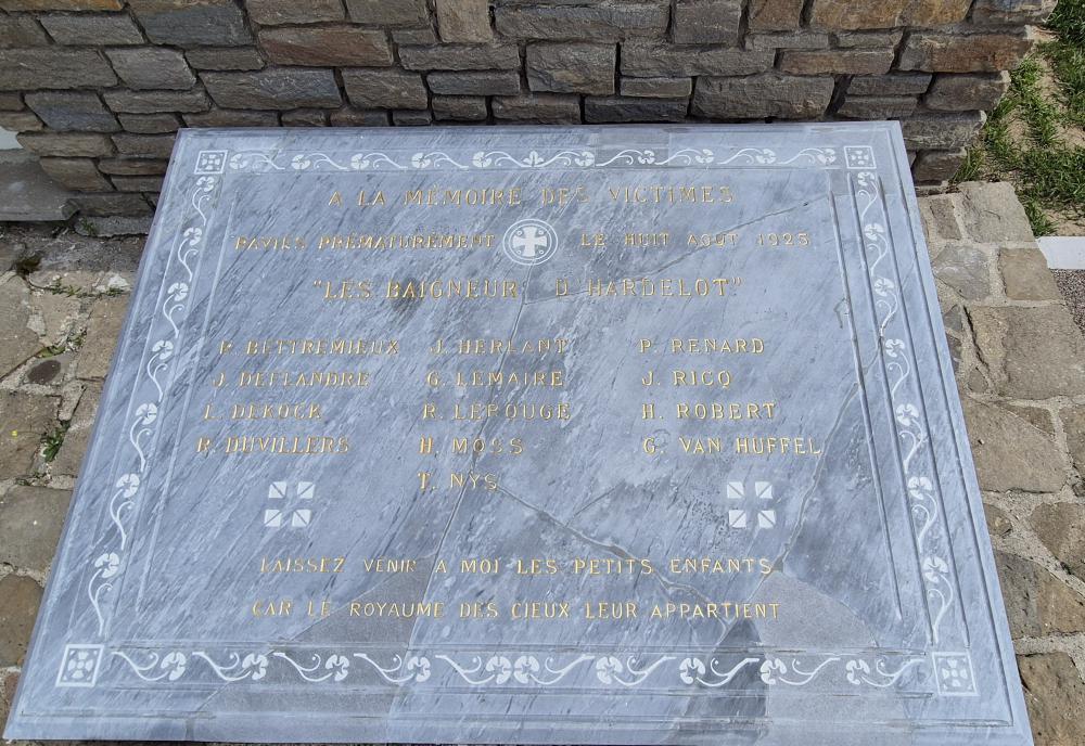 Une dalle du souvenir avait été posée à l’intérieur de la Chapelle d’Hardelot. Elle fut détruite en partie lors d’un bombardement de 1944.Sommairement réparée et installée sur le parvis de l’église reconstruite, elle portait les noms des petites victimes et rappelait la date de la noyade des « baigneurs d’Hardelot ». Cette dalle avait besoin d’une sérieuse restauration.