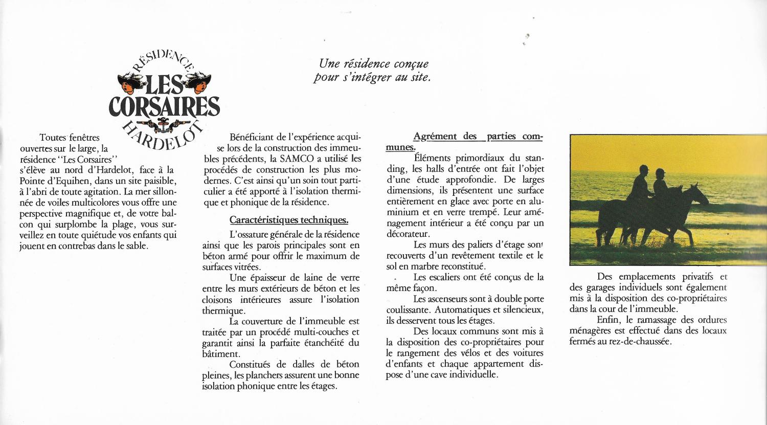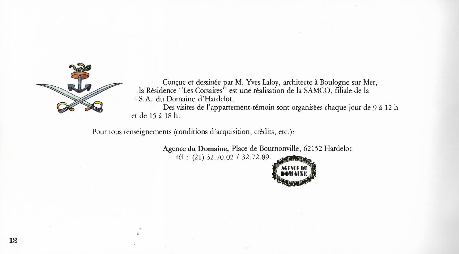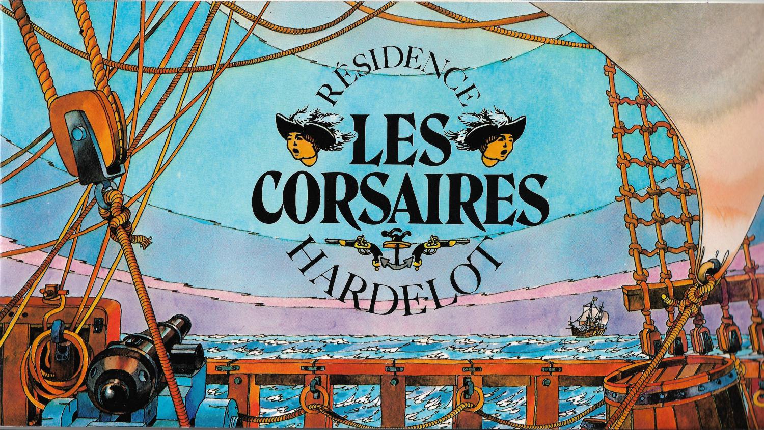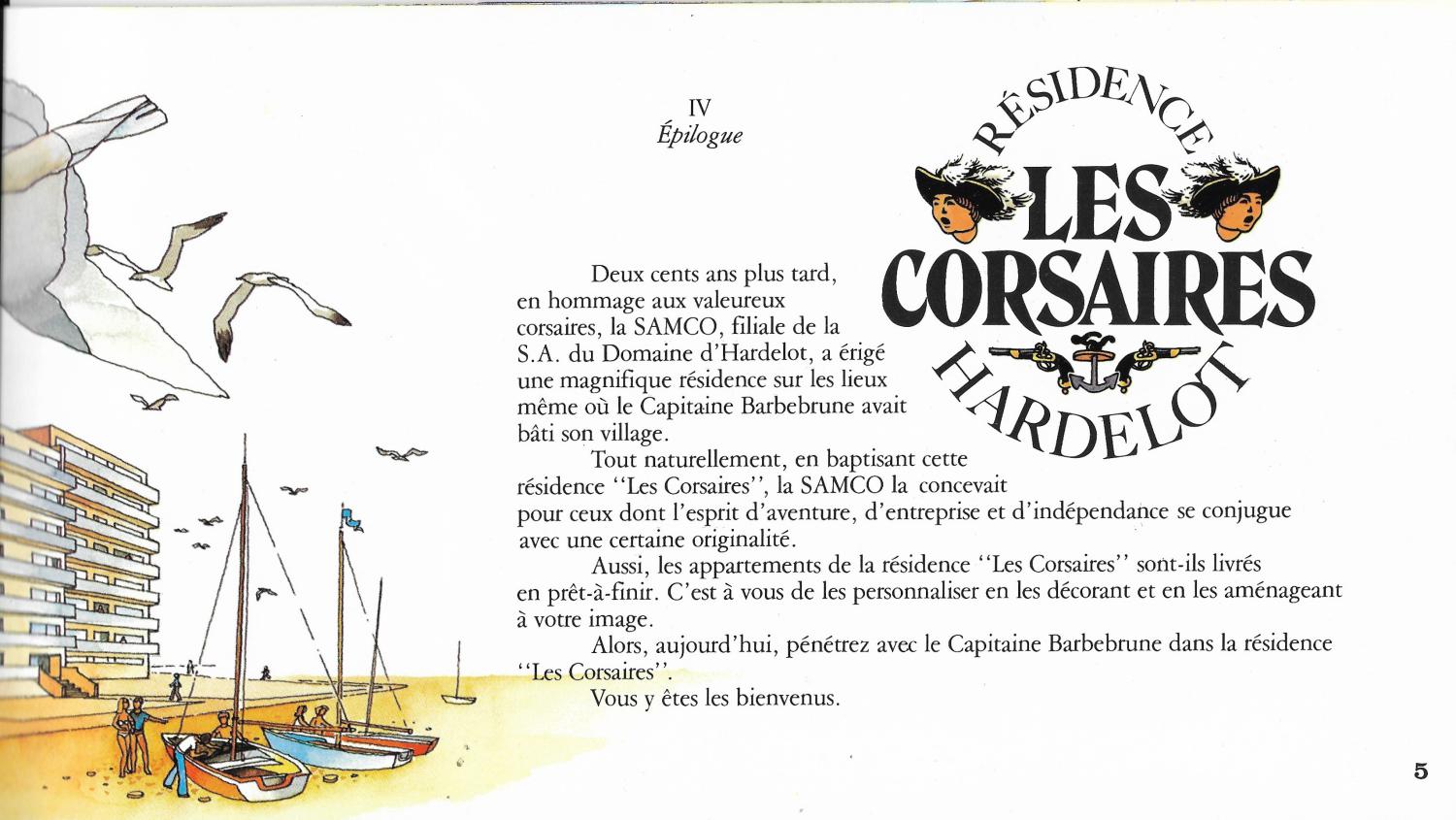 La plaquette de commercialisation des appartements est d’un genre particulier, elle fait appel à l’histoire maritime et met en scène l’équipage d’un bateau corsaire qui dans sa course découvre le site magnifique de la plage d’Hardelot où la mer a la limpidité d’un diamant … Les flibustiers séduits par Hardelot décident de s’y établir…Quelques centaines d’années plus tard une résidence est construite sur l’emplacement du village corsaire…